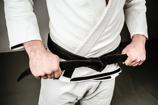 Midsection of Man in A Gi holding Black Belt tied Around His Waist.