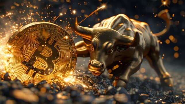 A photo-realistic image of a charging golden bull with a fierce and dynamic posture, colliding with a giant, shimmering Bitcoin symbol, set against the backdrop of a global financial market, sy