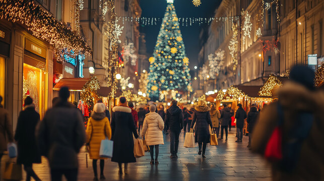 Christmas shoppers walking through a festive street market with a giant decorated Christmas tree, illuminated by holiday lights at night