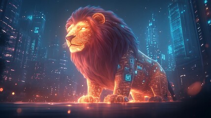 A digital market floor illuminated in gold featuring a giant roaring lion made of financial symbols
