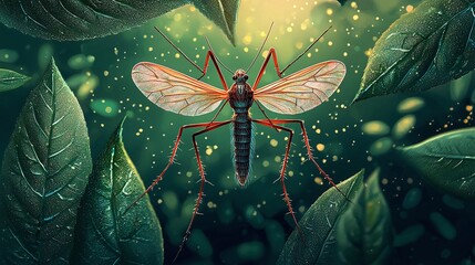 giant mosquito with red legs and transparent wings surrounded by green leaves