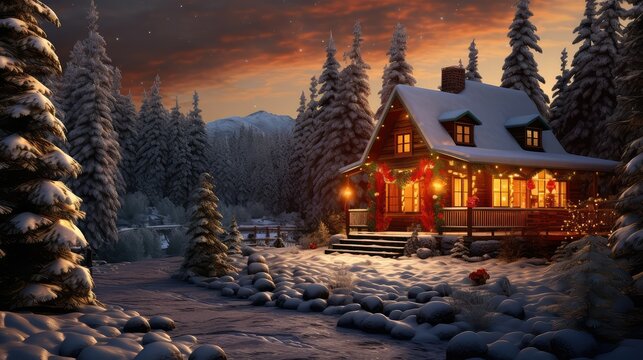christmas landscape, magical christmas forest with lights and gifs