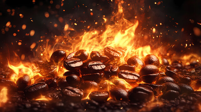 A video shows coffee beans engulfed in flames, created with animated gifs and a soft realism technique. Realism. Illustration