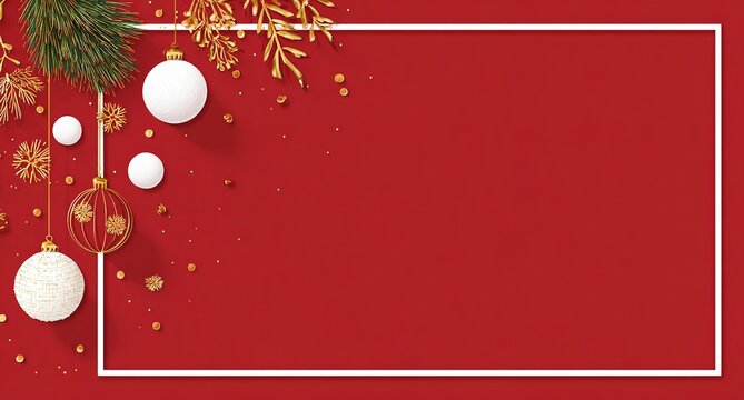 red background, white rectangular blank banner with christmas decorations on the left side of it, flat design style, animated gifs, red and gold, simple, vector illustration, white border