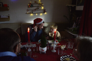 Warm seasonal waste reduction paper cut scene with sustainable holiday tips. red gold palette shows gift packaging, bag, and ornament for conscious Christmas celebration