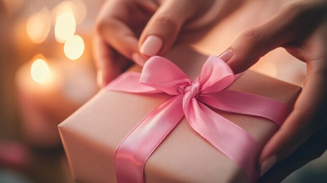 A close-up of hands gently tying a pink ribbon around a gift box, the background softly blurred with a warm golden light, symbolizing care, love, and the act of giving in support of Breast Cancer