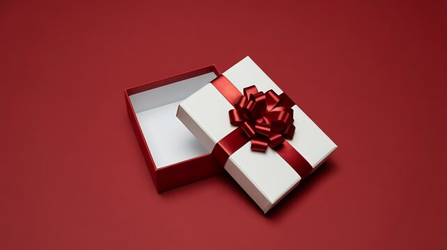 An open gift box with a red ribbon on a red background viewed from above