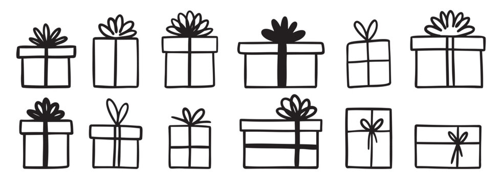 gift box doodle. Gift doodle bow present with ribbon illustration. Present hand drawn icon decorative outline element