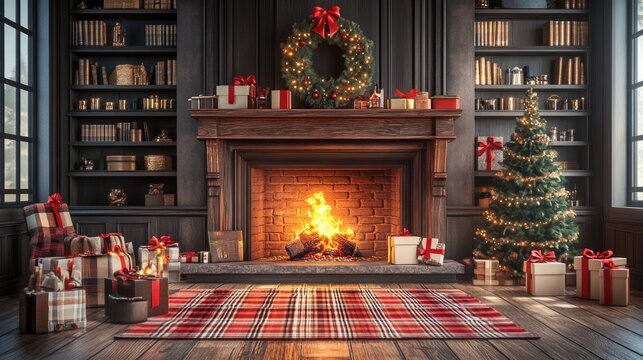 Cozy christmas living room with fireplace, tree, and gifts. First-Foot Day