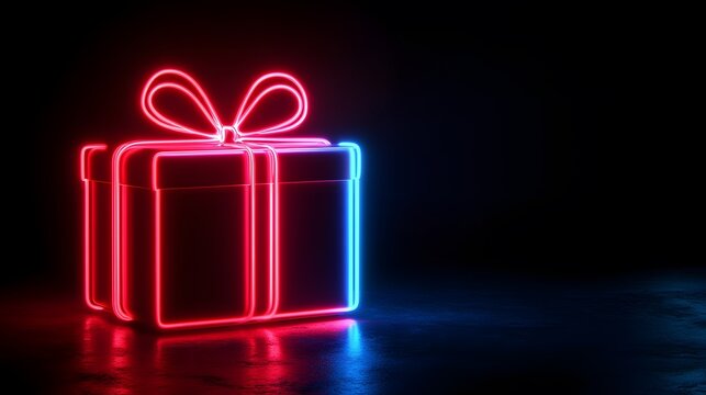 Neon gift box glowing in vibrant colors against a dark background showcasing celebration and surprise elements