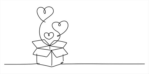 Minimalist one-line art illustration showing hearts floating out of an open delivery box Vector, illustration