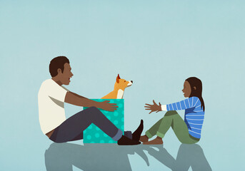 Father surprising daughter with dog in gift box