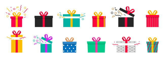 Colorful gift box vector set. Collection of presents with ribbons for birthday, Christmas, holiday celebration. Surprise packages illustration isolated. Cartoon flat design icon.
