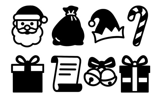 Brutalist Christmas Icons. Santa’s Workshop Set bold vector icon set: Santa, toy sack, elf hat, candy cane, wrapped present, list scroll, sleigh bells, gift box.