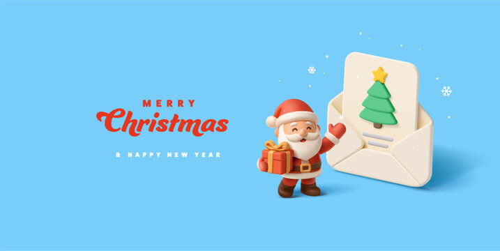 Santa Claus holding letter on wooden table with gift boxes and Christmas tree and cup of hot coffee or tea.  mockup blank