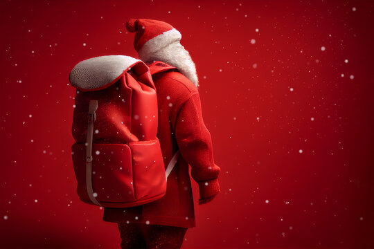 Christmas card. Santa Claus stands on a red background with a big sack on his back. Christmas theme with copy space, snow is falling. Generative AI
