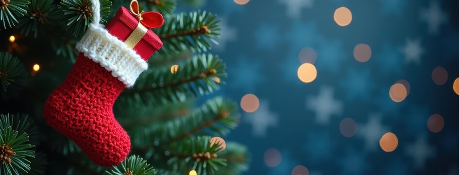 a toy knitted sock with a gift box on the Christmas tree branch on blue bokeh background