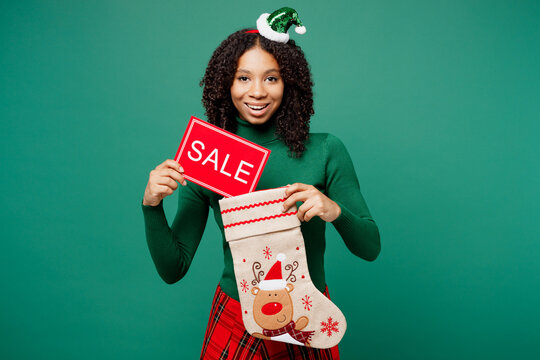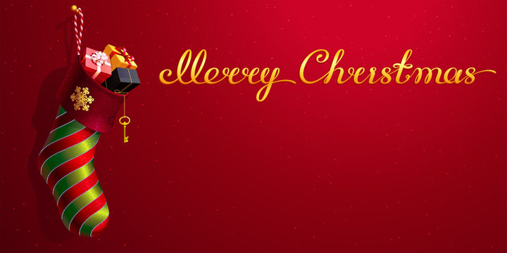Christmas stocking with a golden snowflake, red and green decor. 3D realistic vector sock-shaped bag with a gift boxes. Original calligraphic text Merry Christmas. Red background with a copy space