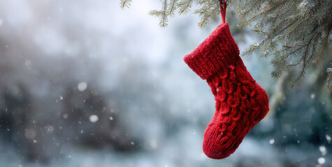 Red knitted Christmas stocking hanging from a tree branch in a snowy winter scene