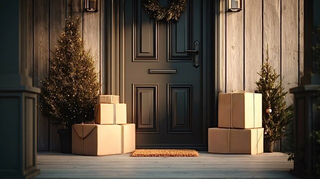 Cozy winter village scene with snow-covered houses and festive gift boxes