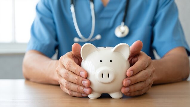 Nurse or doctor with stethoscope holding piggy bank in hand. Concept of medical expenses, finance, saving money, health insurance, medicine, donation and pension. Healthcare service cost.