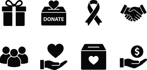 Charity and donation icon set, black vector style, gift box, heart, handshake, community, support, awareness ribbon, giving symbol