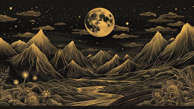 Surreal nighttime mountain landscape with a full moon, stars, and flowing river, artfully rendered in a golden palette.