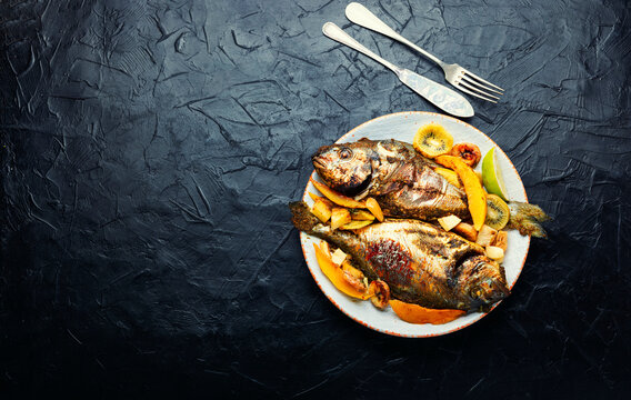 Roasted gilthead fishes with lemon, herbs, salt on black background. Healthy food concept. Food frame.
