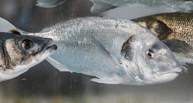 Live gilthead seabream and european seabass swimming in fish tank, ready to be sold in supermarket or fish market