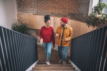 Red haired woman in pink shirt using smartphone against white wall with natural light smiling