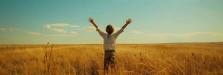 A young boy standing in the middle of an endless field. with his arms raised up towards the sky as if he is waving goodbye to someone who has ging away on plane