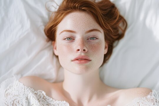 Elegant Woman with Curly Red Hair and Flawless Skin Beauty Portrait