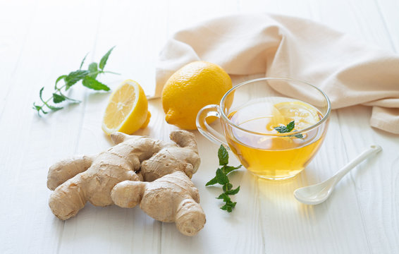 Cup of hot tea with ginger root, lemon and mint on white wooden table