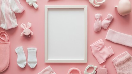 Pink baby shower decorations featuring knitted baby booties, heart shapes, and a gift box with ribbon on a pink background