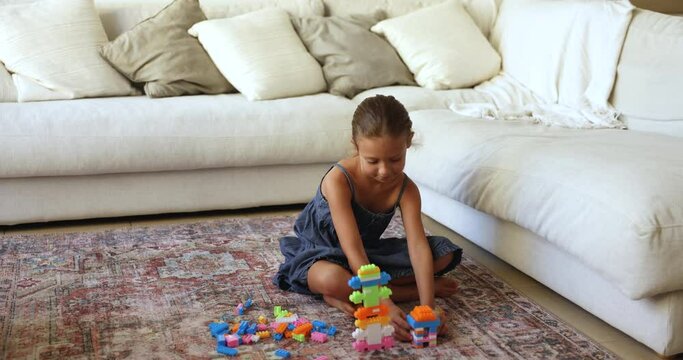 Adorable preschooler girl in casual dress sits on warm floor on carpet in cozy living room play alone using plastic construction toy set, enjoy playtime and creative hobby on weekend leisure at home