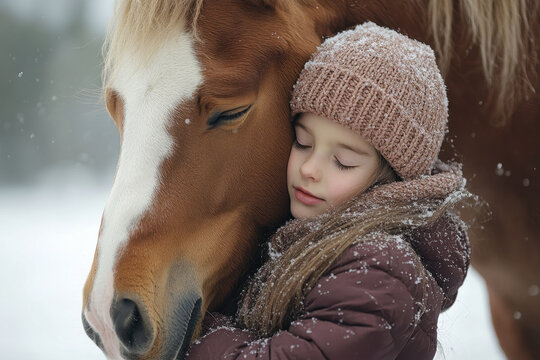 Concept of child and horse friendship and a moment of trust between animal and owner. A little girl hugging her horse at sunset in the field.