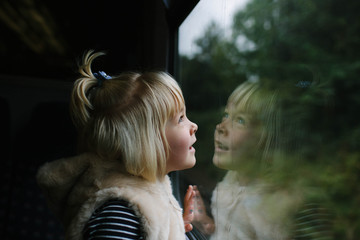 Sad girl looking through a window in a rainy day