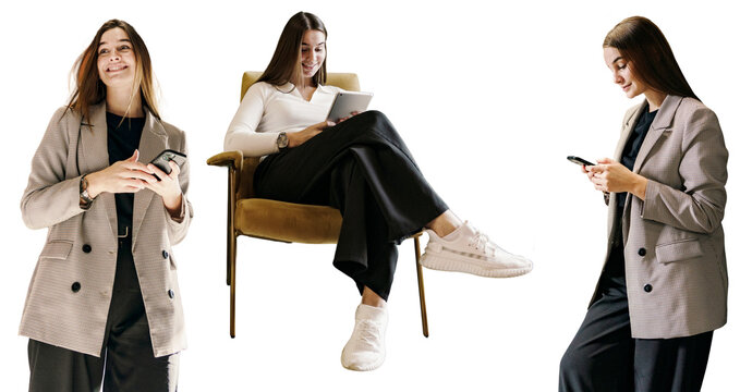 SMM specialist is a human employee in the office sitting in a chair. A modern female copywriter uses a tablet to write texts. Uses a tablet and a phone. Photo collage. Transparent background.
