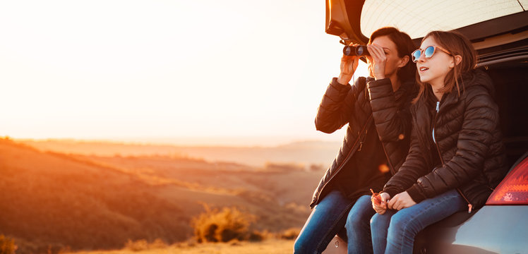 Asian mother and son using binoculars  outdoors in sunny summer day