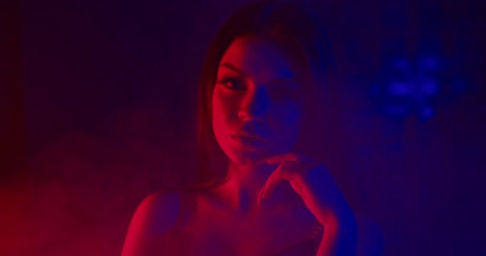 Beautiful sexy girl with trendy make-up in colorful bright lights