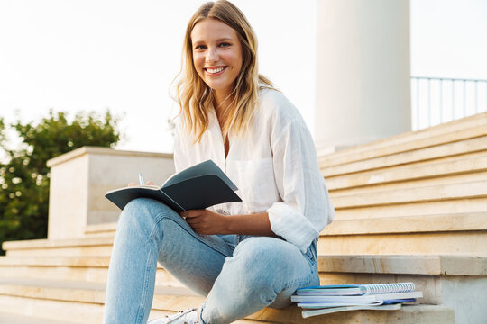 Beautiful happy student girl writing down notes in exercise book