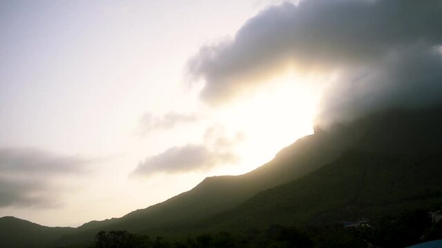 Close up shot of top of Girnar mountain covered with beautiful clouds during monsoon season. At Junagadh, Gujarat, India