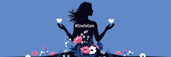 Vector horizontal banner for Women's Day, March 8. Silhouette woman holding heart surrounded by flowers with GiveToGain hashtag. Blue background offers space for text for feminist posters, empowerment