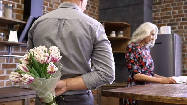 Pleased elderly elegant man giving flowers to his wife which rejoices after that at home
