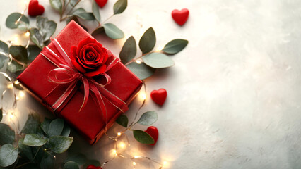 Red rose and gift box with heart-shaped candies for Valentine's Day