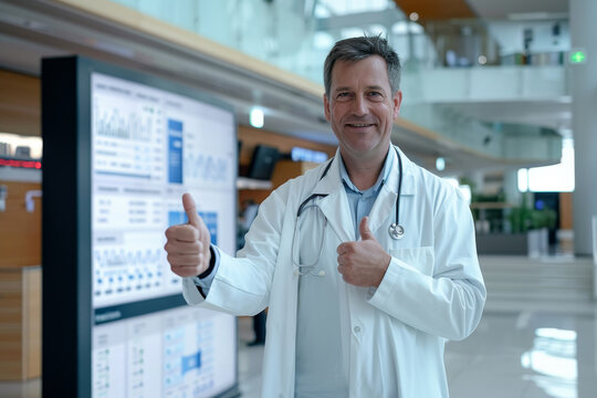 A man in a white lab coat is giving a thumbs up to a computer monitor
