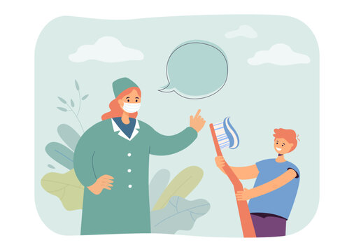 Female dental doctor giving her patient toothbrush