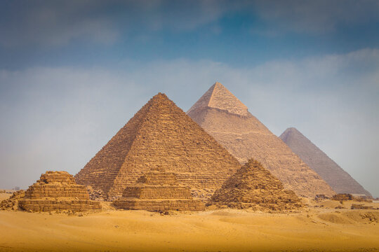 View of The Giza Necropolis, Famed archaeological site featuring the Great Pyramids, the Great Sphinx and The Great Pyramid of Giza in the desert of Giza, Cairo, Egypt.