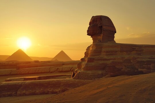 Great sphinx of giza watching pyramids of giza necropolis during golden sunset in egypt