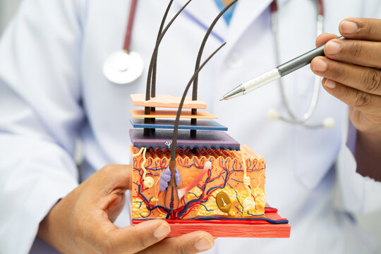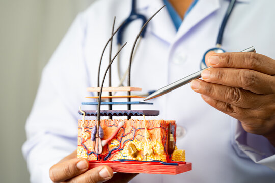 Asian dermatologist doctor holding skin structure model anatomy for treatment in hospital, hair transplant.